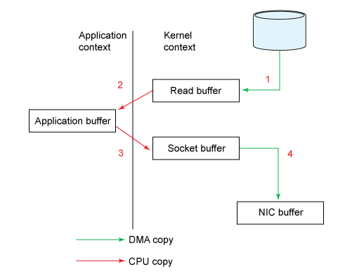 - 디스크에 있는 데이터를 네트워크로 전송하기 위해서는 Kernel 영역과 데이터를 조작하는 Application 영역을 넘나들어야 한다.